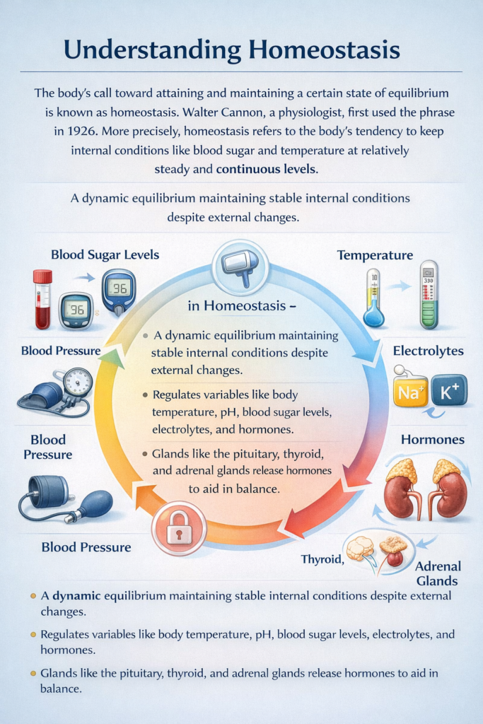 The body’s call toward attaining and maintaining a certain state of equilibrium is known as homeostasis. Walter Cannon, a physiologist, first used the phrase in 1926. More precisely, homeostasis refers to the body’s tendency to keep internal conditions like blood sugar and temperature at relatively steady and continuous levels.