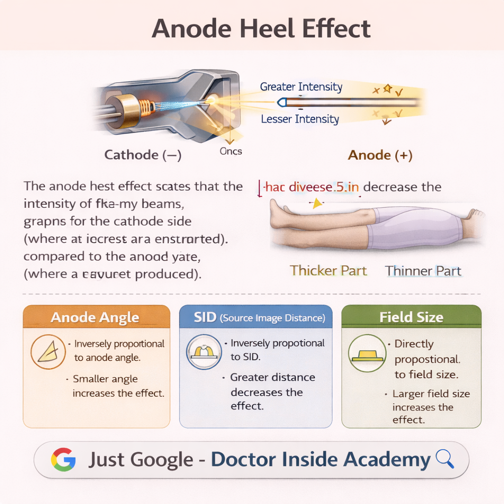Hence, the anode heel effect is caused by the absorption of X-ray photons in the anode side and is influenced by many factors, including anode ankle, SID, and field size.