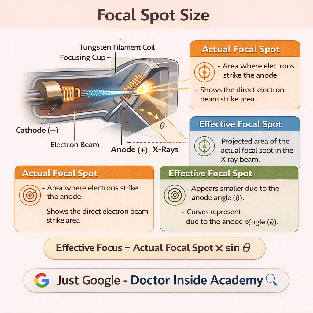 The focal spot size is the area of the anode, where electrons are struck off, and is made up of tungsten. Here, the electron beam is directly influenced by these two characteristics, which are as follows;