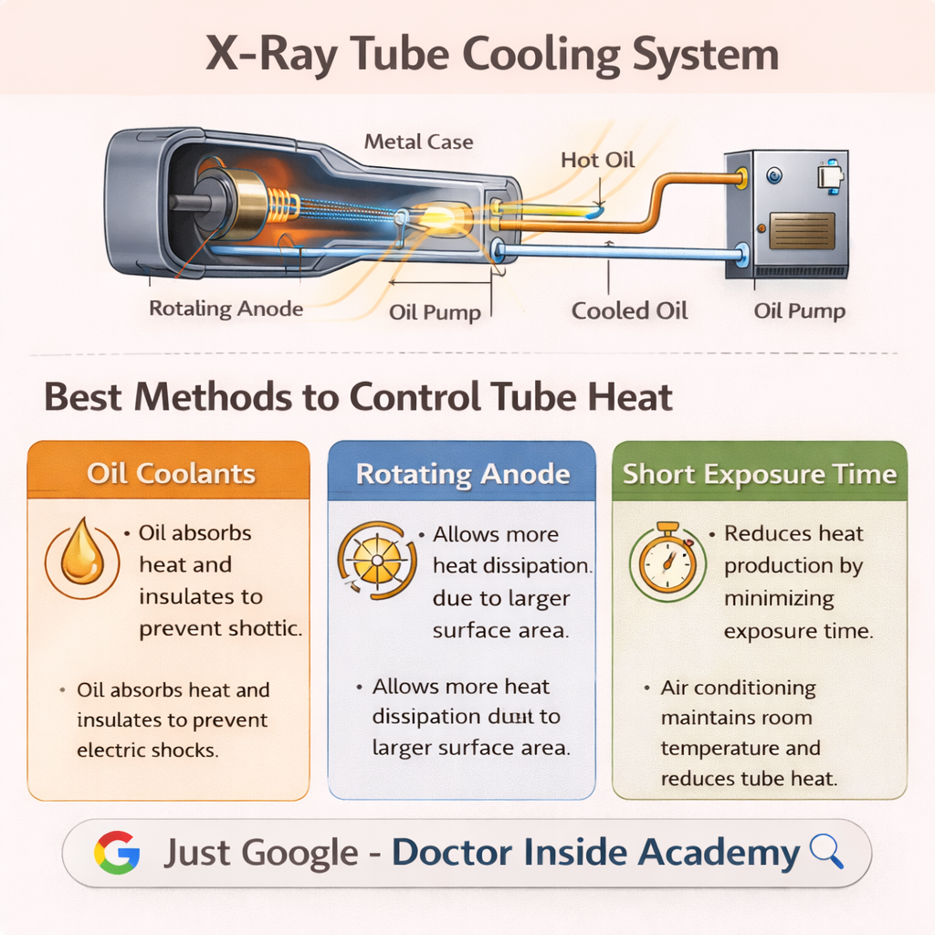 Hence, the use of oil coolants, rotating anode, adequate radiation exposure to the patients, and maintaining room temperature are the most effective ways to control x-ray tube heat and prevent overheating of the tube.