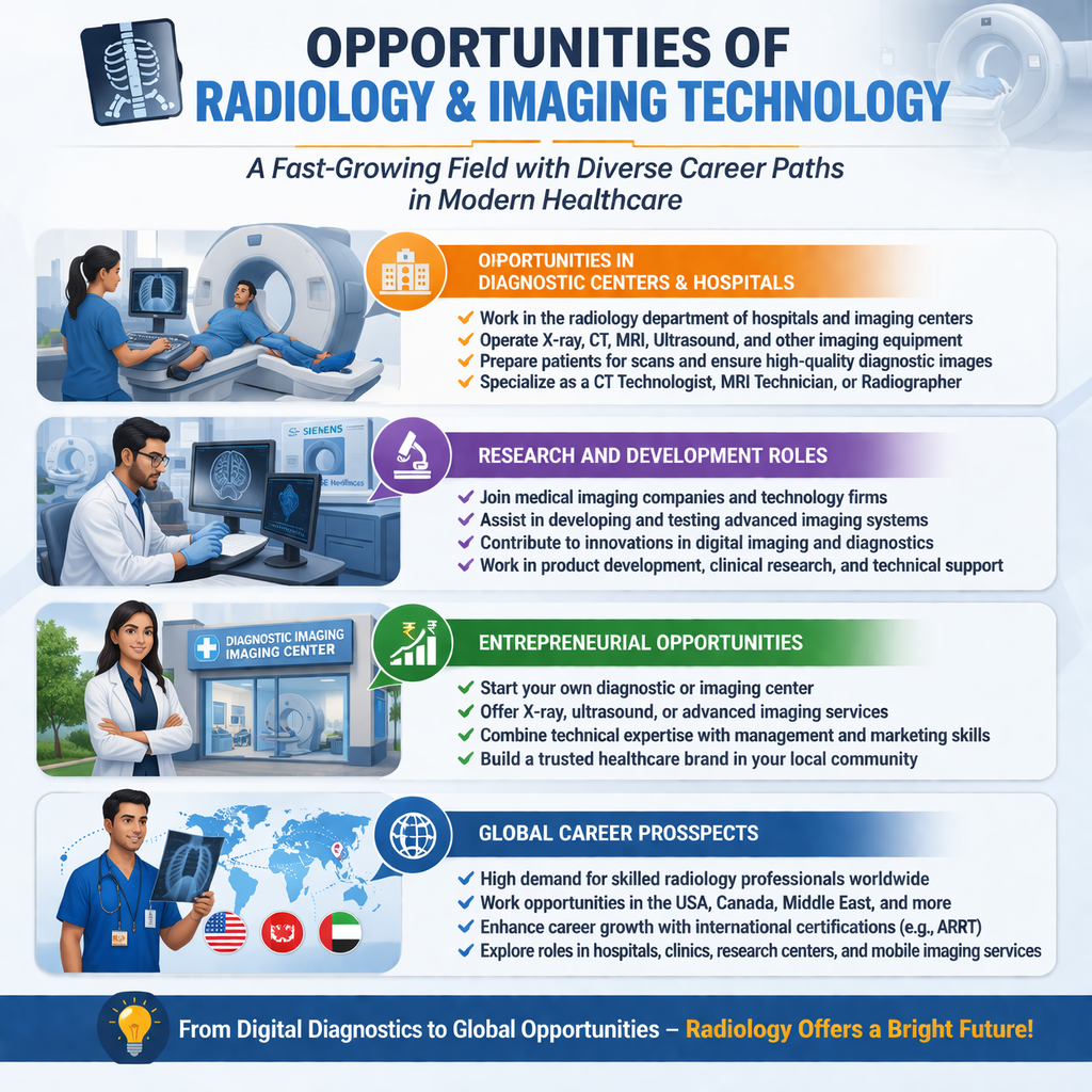 A B.Sc. in Radiology and Imaging Technology is a flexible degree that is in high demand worldwide. The United States, Canada, and the Middle East are just a few of the nations that are actively looking for qualified radiology technicians. Your employment chances might be further improved by obtaining international certifications like ARRT (American Registry of Radiologic Technologists).