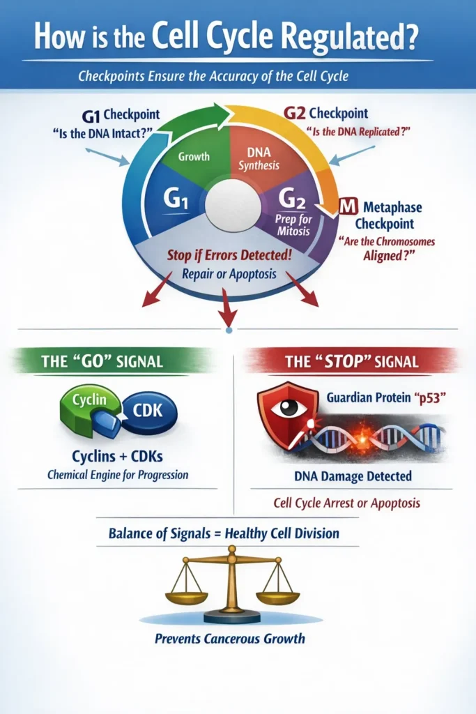 - A complex network of internal checkpoints that serve as security gates controls the cell cycle, guaranteeing that each phase is finished flawlessly before moving on to the next.