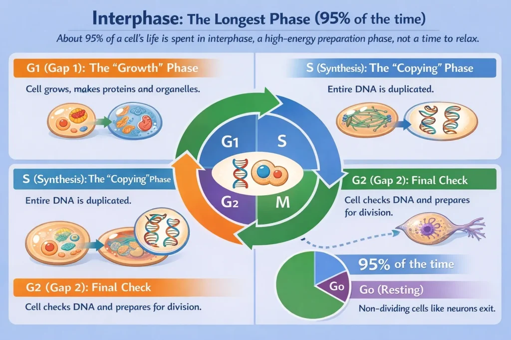 About 95% of a cell’s life is spent in interphase, which is the longest phase of the cell cycle. It’s a high-energy preparation phase, not a time to relax.